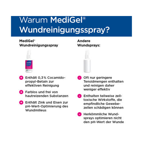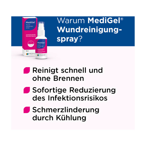 - MediGel® Wundreinigungsspray ist nur zur äußerlichen Anwendung bestimmt und darf nicht eingenommen werden. Nicht zur Infusion oder Injektion anwenden.
