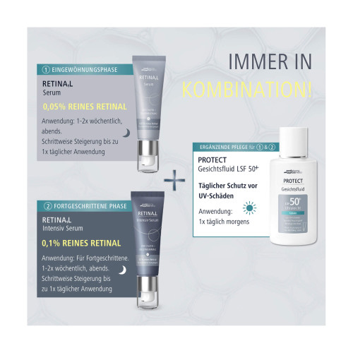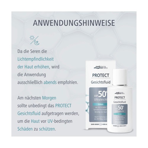 Retinal kann die Lichtempfindlichkeit der Haut erhöhen, was bedeutet, dass die Haut nach der Anwendung besonders anfällig für UV-Schäden ist. Um die optimale Wirkung der Retinal Seren zu gewährleisten und gleichzeitig die Haut vor den schädlichen Auswirkungen der Sonnenstrahlung zu schützen, ist der tägliche Gebrauch des Protect Gesichtsfluids unerlässlich.