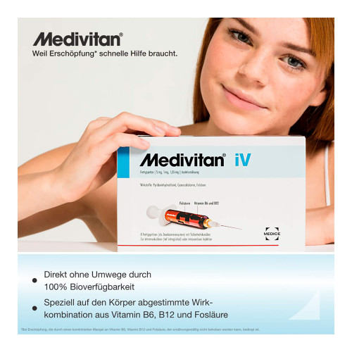 Medivitan iV Fertigspritze. Anwendungsgebiete: Kombinierter Mangel an Vitamin B6, Vitamin B12 und Folsäure bei Erwachsenen, der ernährungsmäßig nicht behoben werden kann. Warnhinweis: Enthält Natrium.