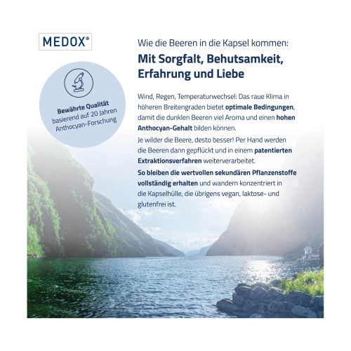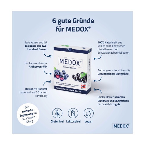 MEDOX® ist ein Extrakt aus wilden skandinavischen Heidelbeeren und Schwarzen Johannisbeeren mit einer hohen Konzentration an Anthocyanen für gesunde Blutgefäße.
