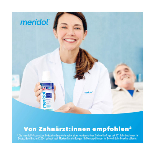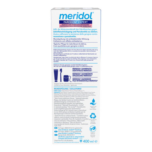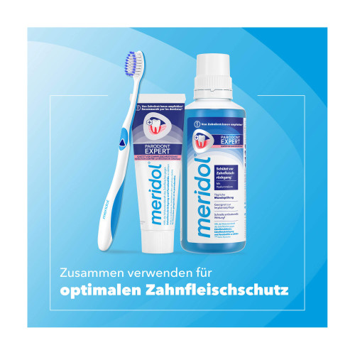 Für optimalen Schutz verwenden Sie die meridol Parodont Expert Mundspülung in Ihrer täglichen Mund- und Zahnpflegeroutine zusammen mit der meridol Parodont Expert Zahnbürste (PZN 11854610), der meridol Parodont Expert Zahnpasta ( PZN 12442269) und der meridol Spezial-Zahnseide (PZN 04123449).