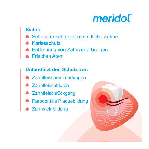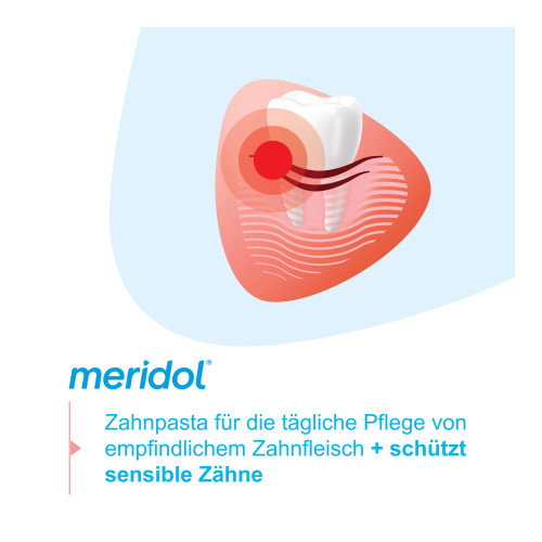 Schützen Sie schmerzempfindliches Zahnfleisch und sensible Zähne mit der meridol Zahnpasta für schmerzempfindliches Zahnfleisch und sensible Zähne. Diese wurde von Experten für die Bekämpfung der Ursache* von Zahnfleischbluten und -entzündungen entwickelt. Die klinisch getestete Zahnpasta reduziert die Schmerzempfindlichkeit von Zahnfleisch mit einer 2-fach Wirkformel für lang anhaltenden Schutz.