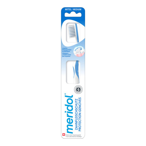 Pflegen Sie Ihre Zähne und Ihr Zahnfleisch effektiv mit unserer von Zahnärzt:innen* empfohlenen meridol® Zahnfleischschutz Mittel Zahnbürste. Die spezielle Kombination aus mittelharten Innenborsten und hochstehenden, weichen Außenborsten sorgt für eine gründliche und schonende Reinigung der Zähne und des Zahnfleischsaums.