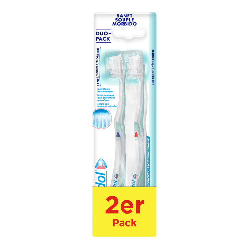 Die meridol® Zahnbürste SANFT punktet mit pinselartigen, mikrofeinen Borstenenden, die Speisereste und Plaque gründlich von der Oberfläche der Zähne bis hin zum Zahnfleischsaum entfernen.