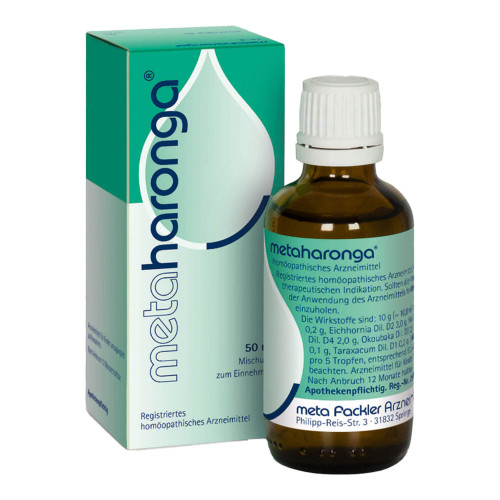 metaharonga Mischung, Mischung zum Einnehmen. Anwendungsgebiete: Registriertes homöopathisches Arzneimittel, daher ohne Angabe einer therapeutischen Indikation. Warnhinweis: Enthält 54 mg Alkohol (Ethanol) pro 5 Tropfen, entsprechend 51,5 Vol.-%.
