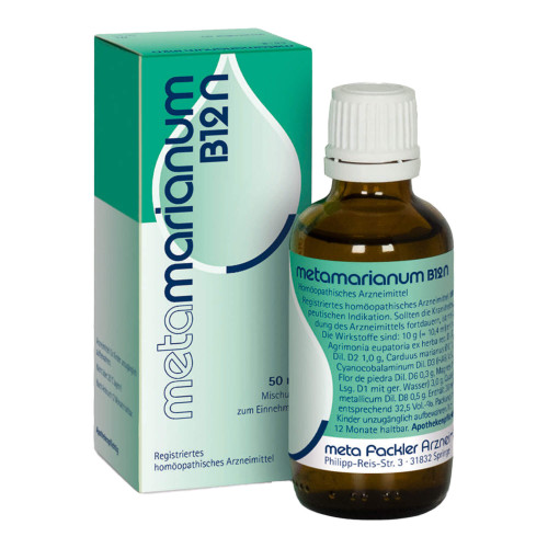 Metamarianum B 12 N, Mischung zum Einnehmen. Anwendungsgebiete:Registriertes homöopathisches Arzneimittel, daher ohne Angabe einer therapeutischen Indikation. Warnhinweis: Enthält 36 mg Alkohol (Ethanol) pro 5 Tropfen, entsprechend 32,5 Vol.-%.