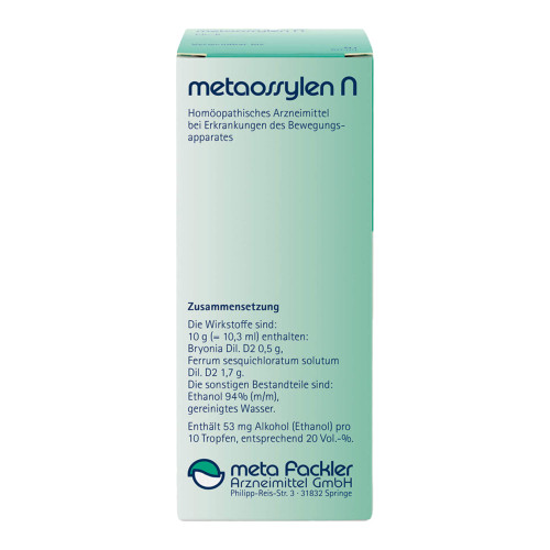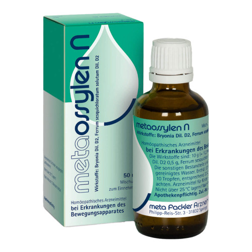 Metaossylen N, Mischung zum Einnehmen. Anwendungsgebiete: Die Anwendungsgebiete leiten sich von den homöopathischen Arzneimittelbildern ab. Dazu gehören: Akuter und chronischer Rheumatismus mit schmerzhafter Schulter. Hinweis: Bei akuten Gelenkbeschwerden, die z. B. mit Rötung, Schwellung oder Überwärmung einhergehen sowie bei anhaltenden, unklaren oder neu auftretenden Beschwerden sollte ein Arzt aufgesucht werden. Enthält 53 mg Alkohol (Ethanol) pro 10 Tropfen, entsprechen 20 Vol.-%.