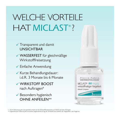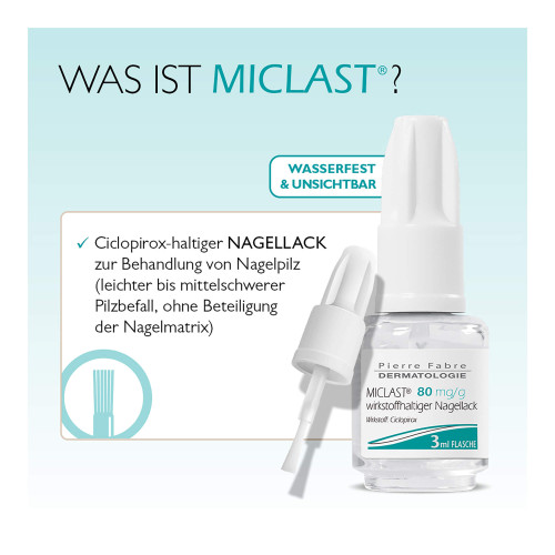 MICLAST® 80 mg/g. Wirkstoff: Ciclopirox. Anwendungsgebiete: Zur Behandlung von leichtem bis mäßig schwerem Nagelpilz-Befall (Onychomykose) der Finger- und Zehennägel bestimmt. Der Wirkstoff Ciclopirox dringt in den Nagel ein und tötet die Pilze ab. Warnhinweis: Enthält Ethylacetat, 2-Propanol (Ph.Eur.), Poly(butylhydrogenmaleat-comethoxyethylen) (1:1).