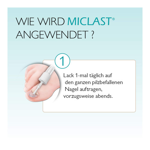 - einmal täglich, vorzugsweise abends, alle betroffenen Nägel vollständig mit einer dünnen Schicht MICLAST® bedecken,