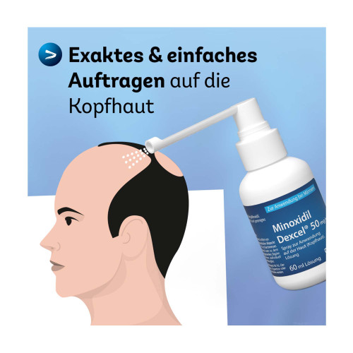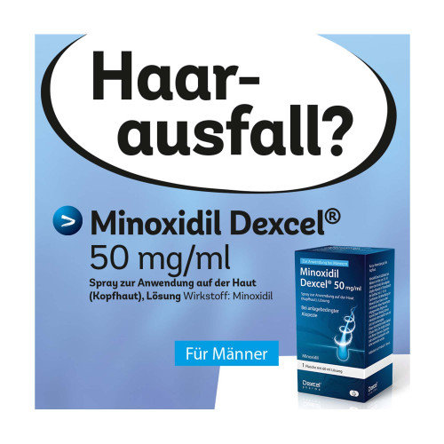 Minoxidil Dexcel 50 mg/ml Spray zur Anwendung auf der Haut (Kopfhaut), Lösung. Anwendungsgebiete: Stabilisiert bei Männern im Alter von 18-49 Jahren den Verlauf des anlagebedingten Haarverlustes im Tonsurbereich der Kopfhaut von 3-10 cm Durchmesser (androgenetische Alopezie vom männlichen Typ) und kann so dem Fortschreiten dieses Haarverlustes entgegenwirken. Beginn und Ausmaß dieser Wirkung können individuell unterschiedlich sein und sind nicht vorhersagbar. Warnhinweise: Enthält Propylenglycol und Ethanol. Direkten Kontakt mit offenen Flammen, Zigaretten oder anderen Brandquellen vermeiden.