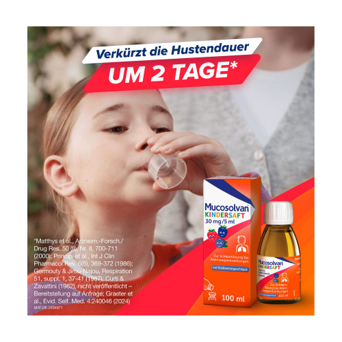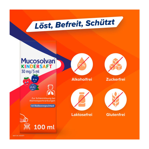 Mucosolvan® Kindersaft 30 mg/5 ml. Wirkstoff: Ambroxolhydrochlorid. Anwendungsgebiete: Zur Schleim lösenden Behandlung bei akuten und chronischen Erkrankungen der Bronchien und der Lunge mit zähem Schleim. Warnhinweise: Enthält Sorbitol, Benzoesäure und Propylenglycol.