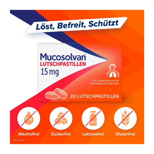 Mucosolvan® Lutschpastillen 15 mg. Wirkstoff: Ambroxolhydrochlorid. Anwendungsgebiete: Zur Schleim lösenden Behandlung bei akuten und chronischen Erkrankungen der Bronchien und der Lunge mit zähem Schleim. Warnhinweis: Enthält Sorbitol, Maltitol, Pfefferminzöl und Eukalyptusöl.