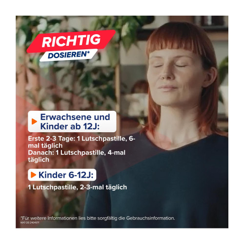 | Jugendliche ab 12 Jahren und Erwachsene | 1 Lutschtablette | 4-mal täglich | verteilt über den Tag |