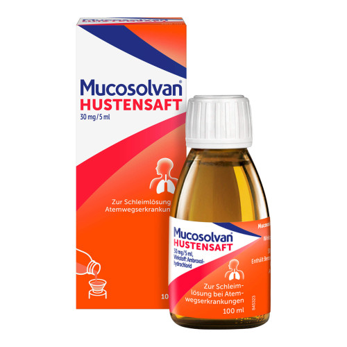 Mucosolvan® Hustensaft 30 mg/5 ml. Wirkstoff: Ambroxolhydrochlorid. Anwendungsgebiete: Zur schleimlösenden Behandlung bei akuten und chronischen Erkrankungen der Bronchien und der Lunge mit zähem Schleim. Warnhinweis: Enthält Benzoesäure und Propylenglycol.