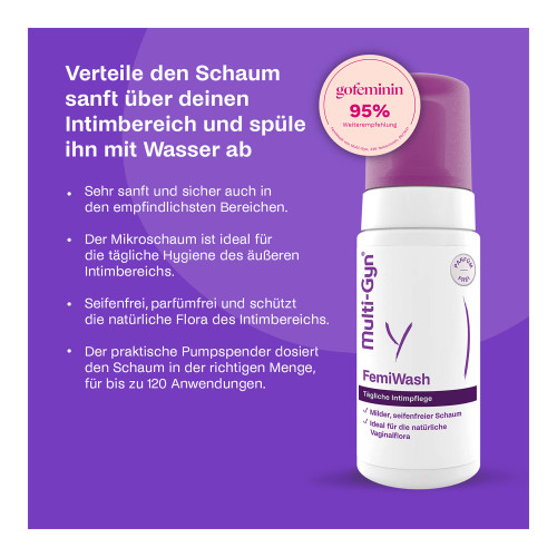 Multi-Gyn FemiWash ist ideal für die tägliche Intimpflege und auch hervorragend für eine sanfte Rasur geeignet. Der Multi-Gyn FemiWash reinigt und erfrischt den Intimbereich. Der Mikroschaum ist mild und angenehm, auch bei sehr empfindlicher und überempfindlicher Haut. - Reicht für ca. 120 Anwendungen