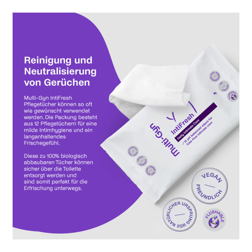In jeder Packung Multi-Gyn IntiFresh Feuchttücher befinden sich 12 pflegende Tücher für die unkomplizierte Intimpflege, auch für unterwegs. Die Tücher sind zu 100 % biologisch abbaubar und können über die Toilette entsorgt werden. - Erfrischende, kühlende und geruchsneutralisierende Pflegetücher: