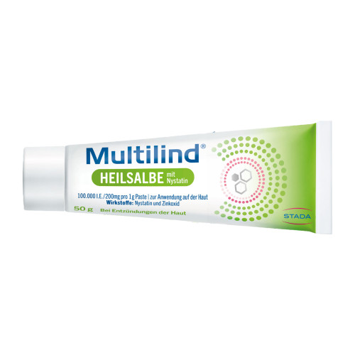 Multilind Heilsalbe mit Nystatin 100 000 I.E./200 mg pro 1 g Paste, zur Anwendung auf der Haut. Anwendungsgebiete: Anwendung bei Entzündungen der Haut und Schleimhaut, durch mechanische Reizung bedingtes Wundsein („Wolf“), rote, juckende und brennende Herde in den Körperfalten, im Gesäß- und Brustbereich und zwischen den Oberschenkeln, z.B. Windeldermatitis. Warnhinweis: Enthält Parfümöl Citrus-Rose.