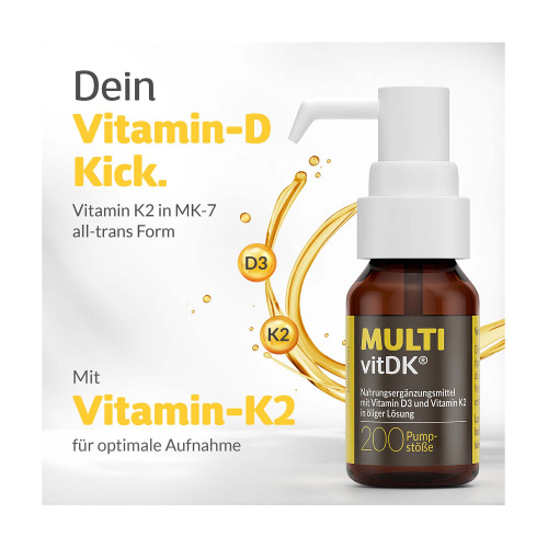 MULTIvitDK® ist eine hochwertige Nahrungsergänzung, die speziell entwickelt wurde, um die tägliche Versorgung mit den wichtigen Vitaminen D3 und K2 zu unterstützen. Vitamin K2 ist ein wichtiger Baustein für die Knochengesundheit. Es arbeitet eng mit Vitamin D3 zusammen, indem es dafür sorgt, dass Calcium gezielt in die Knochen eingebaut wird, anstatt sich in den Blutgefäßen abzulagern. Diese synergetische Wirkung zwischen Vitamin D3 und K2 ist der Grund, warum diese beiden Vitamine am besten in Kombination eingenommen werden sollten. MULTIvitDK® liefert dieses starke Duo in einer praktischen, öligen Lösung, die besonders gut vom Körper aufgenommen werden kann.