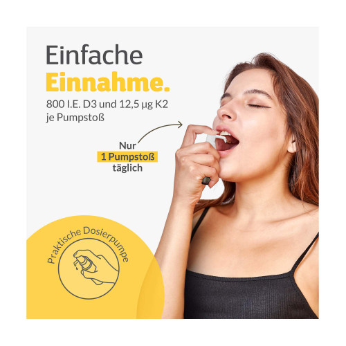 Die Einnahme von MULTIvitDK® ist denkbar einfach. Mit der praktischen Dosierpumpe lässt sich die Menge perfekt dosieren, sodass du täglich deine benötigte Menge Vitamin D3 und K2 ohne Aufwand einnehmen kannst. Die geschmacksneutrale Lösung sorgt für eine angenehme Einnahme. Ein einziger Pumpstoß pro Tag genügt, um die empfohlene Tagesdosis von 800 I.E. Vitamin D3 und 12,5 µg Vitamin K2 zu erreichen, was die Anwendung sehr einfach und zeitsparend macht.