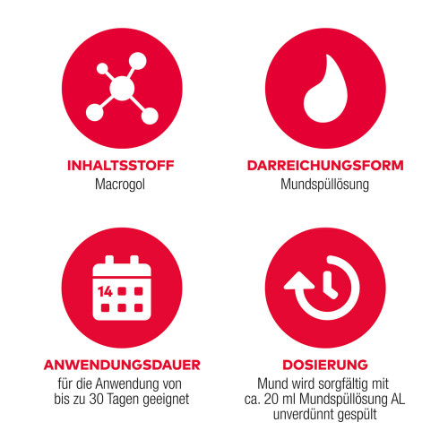 Mundspüllösung AL ist besonders gut verträglich bei empfindlicher Mundschleimhaut oder oraler Mucositis, da es keinen Alkohol oder reizende Bestandteile enthält. Die speziell milden Bestandteile (Macrogole) von Mundspüllösung AL benetzen die Mundschleimhaut intensiv und lösen Beläge während der Spülung.