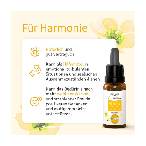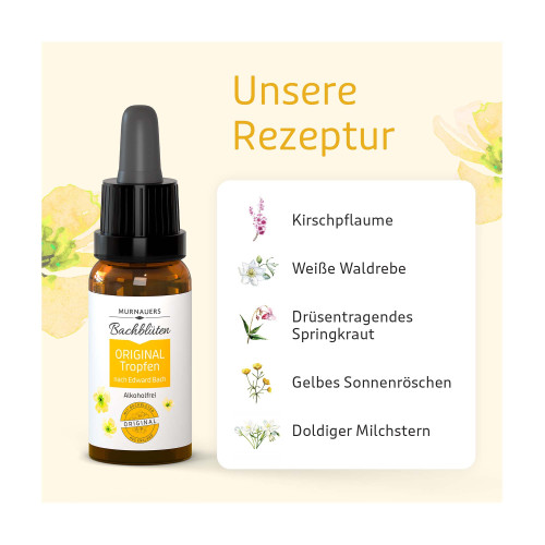 Hergestellt mit der Original Bachblütenmischung nach Edward Bach aus England: Kirschpflaume, Weiße Waldrebe, Drüsentragendes Springkraut, Gelbes Sonnenröschen, Doldiger Milchstern.
