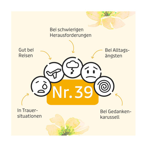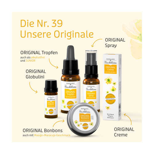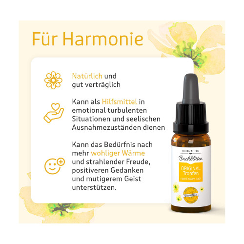 Original Bachblütenmischung einen Extrakt aus 5 Blütenauszügen: Kirschpflaume, Weiße Waldrebe, Drüsentragendes Springkraut, Gelbes Sonnenröschen, Doldiger Milchstern.