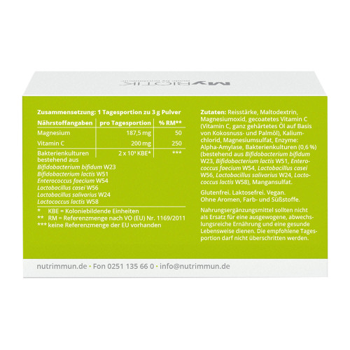 Reisstärke, Maltodextrin, Magnesiumoxid, gecoatetes Vitamin C (Vitamin C, ganz gehärtetes Öl auf Basis von Kokosnuss- und Palmöl), Kaliumchlorid, Magnesiumsulfat, Enzyme: Alpha-Amylase, Bakterienkulturen (0,6 %) (bestehend aus Bifidobacterium bifidum W23, Bifidobacterium lactis W51, Enterococcus faecium W54, Lactobacillus casei W56, Lactobacillus salivarius W24, Lactococcus lactis W58), Mangansulfat.