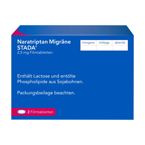 Naratriptan Migräne STADA® 2,5 mg Filmtabletten. Wirkstoff: Naratriptan. Anwendungsgebiete: Zur Behandlung von Migräne. Warnhinweis: Enthält Lactose und entölte Phospholipide aus Sojabohnen.