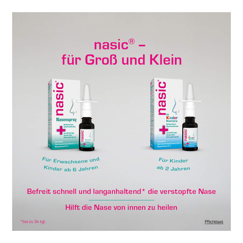 nasic enthält eine Wirkstoffkonzentration, die für Erwachsene und Schulkinder bestimmt ist und somit nicht für Säuglinge und Kleinkinder unter 6 Jahren geeignet ist. Für die Altersgruppe der Kinder zwischen 2 und 6 Jahren stehen entsprechende Nasensprays mit einem geringeren Gehalt des abschwellenden Wirkstoffes Xylometazolinhydrochlorid zur Verfügung.