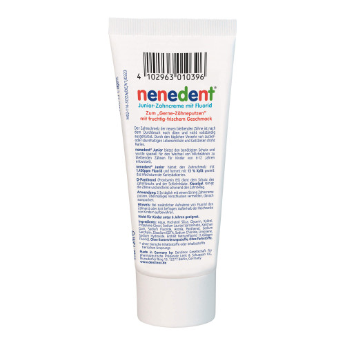 nenedent® Junior-Zahncreme wurde speziell für den Wechsel von Milchzähnen zu den bleibenden Zähnen für Kinder von 6-12 Jahren entwickelt. Der Zahnschmelz der neuen bleibenden Zähne ist nach dem Durchbruch noch dünn und nicht vollständig ausgehärtet. Durch den täglichen Verzehr von zucker- und säurehaltigen Lebensmitteln und Getränken wird der Zahnschmelz permanent angegriffen. nenedent® Junior bietet den benötigten Schutz. Sie härtet den Zahnschmelz mit 1.450 ppm Natriumfluorid und hemmt das Wachstum von Kariesbakterien mit 13 % Xylit. Zum Schutz des gereizten Zahnfleischs durch die weiteren durchbrechenden Zähne dient das D-Panthenol (Provitamin B5). Der gute Geschmack motiviert die Junioren zum regelmäßigen Zähneputzen.