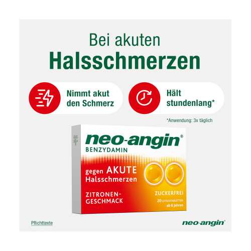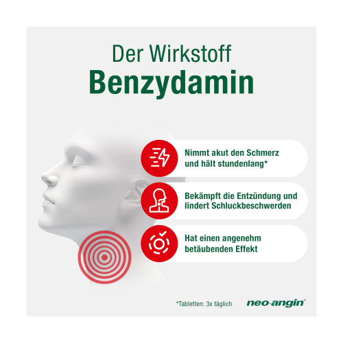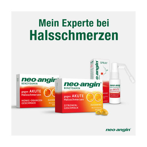 neo-angin® Benzydamin Zitronengeschmack. Wirkstoff: Benzydaminhydrochlorid. Anwendungsgebiete: neo-angin® Benzydamin gegen akute Halsschmerzen wird angewendet bei Erwachsenen und Kindern ab 6 Jahren zur symptomatischen, lokalen Behandlung von akuten Halsschmerzen, die mit den typischen Entzündungssymptomen wie Schmerzen, Rötung oder Schwellung im Mund- und Rachenraum einhergehen. Warnhinweise: Enthält lsomalt, Aspartam, Pfefferminzöl und Natrium.
