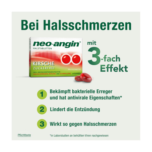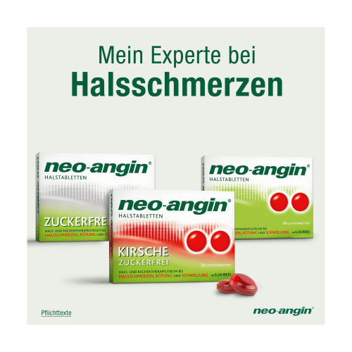 neo-angin® Halstabletten Kirsche. Anwendungsgebiete: Zur unterstützenden Behandlung bei Entzündungen der Rachenschleimhaut, die mit typischen Symptomen wie Halsschmerzen, Rötung oder Schwellung einhergehen. Zur Anwendung bei Erwachsenen und Kindern ab 6 Jahren. Warnhinweise: Enthält Ponceau 4R (E 124), Benzylalkohol, Butylhydroxyanisol (E 320) und lsomalt (E 953).