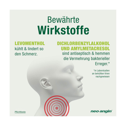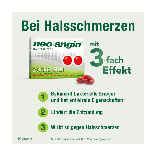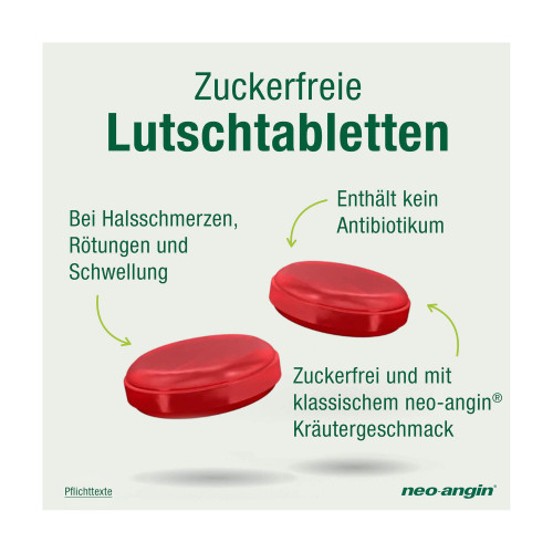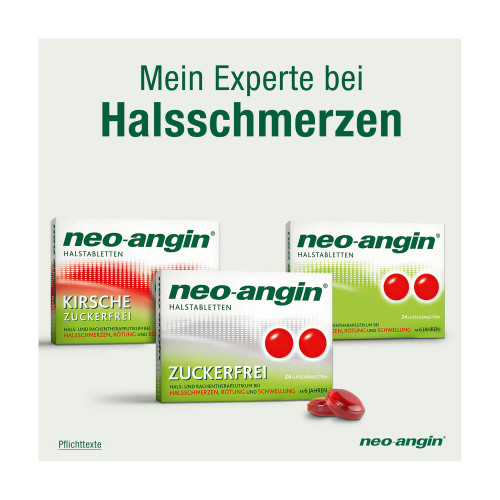 neo-angin Halstabletten zuckerfrei. Anwendungsgebiete: Zur unterstützenden Behandlung bei Entzündungen der Rachenschleimhaut, die mit typischen Symptomen wie Halsschmerzen, Rötung oder Schwellung einhergehen. Zur Anwendung bei Erwachsenen und Kindern ab 6 Jahren. Wenn Sie sich nach 3-4 Tagen nicht besser oder gar schlechter fühlt, sollten Sie sich an Ihren Arzt wenden. Warnhinweise: Enthält Ponceau 4R (E124), Isomalt (E953) und Pfefferminzöl.