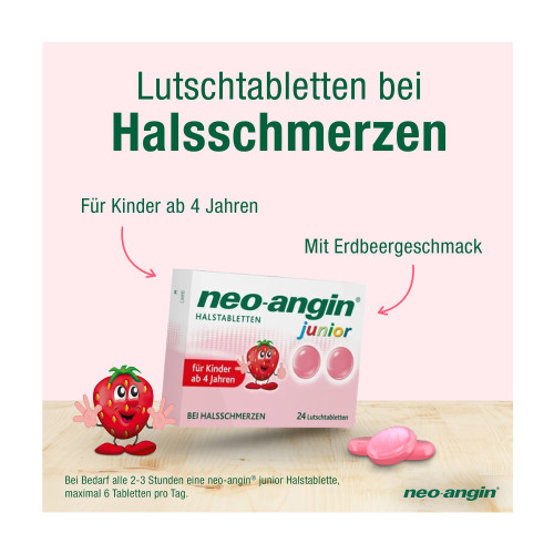 Erwachsene und Kinder ab 4 Jahren lutschen bei Bedarf 2-3 Stunden eine neo-angin junior Halstabletten, maximal 6 Tabletten pro Tag.