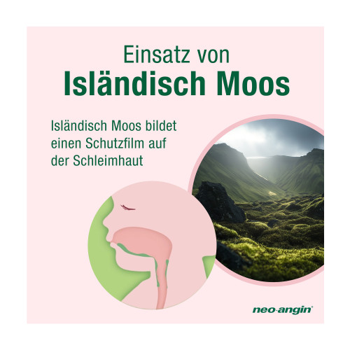 Isländisch Moss liegt sich beim Lutschen als pflanzlicher Film auf Mund- und Rachenschleimhaut und schützt diese. Durch den Lutschvorgang wird eine gleichmäßige Verteilung der Wirkstoffe auf Mund- und Rachenschleimhaut gewährleistet.