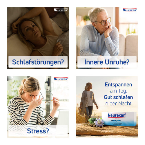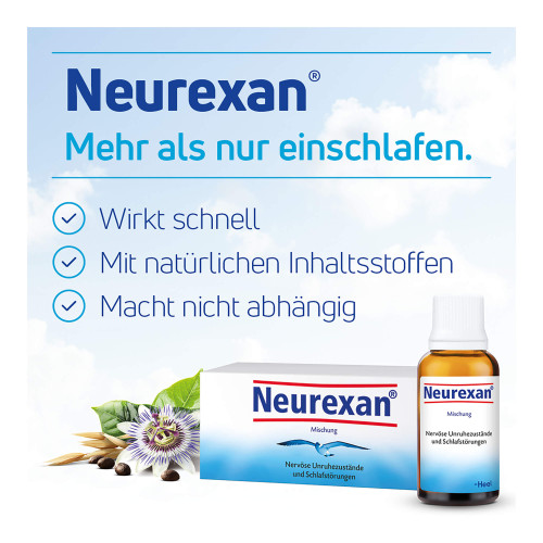 Neurexan Mischung. Anwendungsgebiete: Die Anwendungsgebiete leiten sich von den homöopathischen Arzneimittelbildern ab. Dazu gehören: Schlafstörungen und nervöse Unruhezustände. Warnhinweis: Enthält 36 Vol.-% Alkohol! Zul.-Nr.: 16814.00.00.