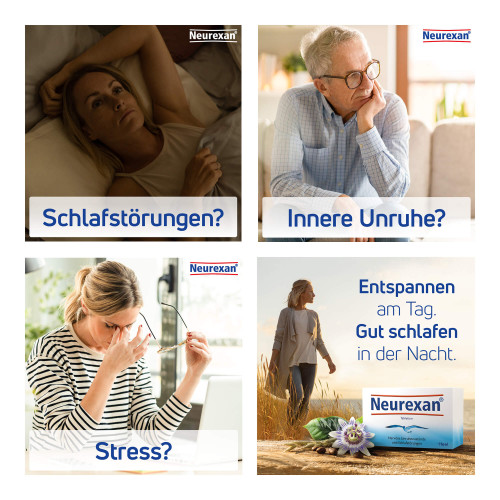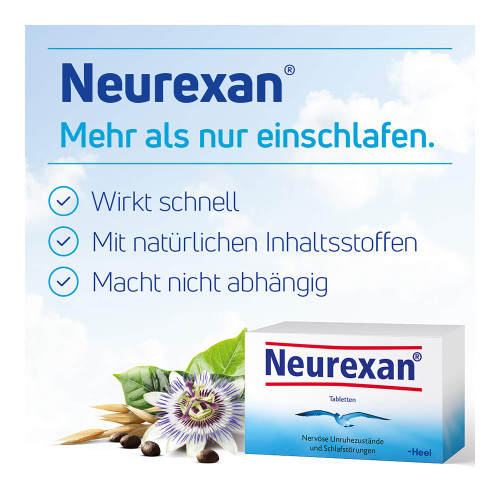 Neurexan Tabletten. Wirkstoffe: Passiflora incarnata Dil. D2, Avena sativa Dil. D2, Coffea arabica Dil. D12, Zincum isovalerianicum Dil. D4 jeweils 0,6 mg. Anwendungsgebiete: Sie leiten sich von den homöopathischen Arzneimittelbildern ab. Dazu gehören: Schlafstörungen und nervöse Unruhezustände. Warnhinweise: Enthält Lactose. 1 Tablette = 0,025 BE. Zul.-Nr.: 16814.00.01.