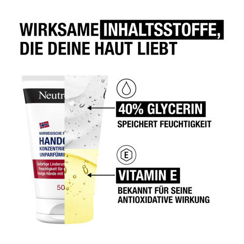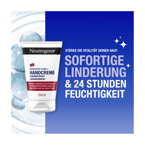 Unsere Hände sind immer im Einsatz und den verschiedensten Einflüssen ausgesetzt (Wasser und Seife, Hitze, Kälte, UV-Licht, etc.). Gib ihnen daher besondere Aufmerksamkeit und Pflege, damit sie immer schön und gepflegt aussehen. Schließlich sind sie oft unser erster Kontakt mit anderen Menschen. Die Neutrogena Handcreme beruhigt sofort und schützt besonders trockene und rissige Hände. Da die Creme konzentriert ist, genügt ein einziger Tropfen für die Anwendung. Sie spendet der Haut intensive Feuchtigkeit und schützt sie vor dem Austrocknen. Selbst unter extremsten Bedingungen werden die Hände spürbar sanfter und glatter.