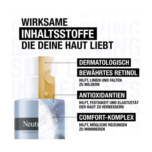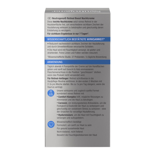 Die Neutrogena Retinol Boost Nachtcreme wurde mit Dermatologen entwickelt, um sichtbare Zeichen der Hautalterung gezielt zu bekämpfen. Die Formel mit reinem Retinol, Hyaluronsäure und dem Antioxidans Carnosin reduziert feine Linien, Falten und Pigmentflecken sichtbar. Gleichzeitig verbessert sie die Hautelastizität und schützt vor oxidativem Stress – einer der Hauptursachen für vorzeitige Hautalterung.