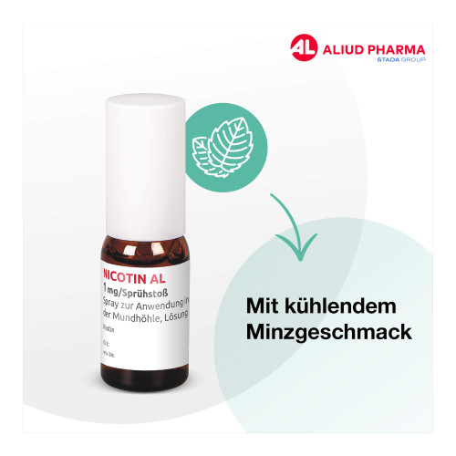Nicotin AL 1 mg/Sprühstoß, Spray zur Anwendung in der Mundhöhle, Lösung. Anwendungsgebiete: Zur Anwendung bei Erwachsenen. Zur Behandlung der Tabakabhängigkeit bei Erwachsenen durch Linderung der Nicotinentzugssymptome, einschließlich des Rauchverlangens, beim Versuch das Rauchen aufzugeben. Die komplette Einstellung des Rauchens sollte das endgültige Ziel sein. Warnhinweis: Enthält Ethanol, Natrium, Propylenglycol und Benzylalkohol.