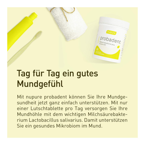 Erwachsene nehmen täglich eine nupure probadent Lutschtablette. Idealerweise sollte die Tablette kurz nach dem Zähneputzen bzw. der täglichen Mundhygiene verwendet werden.