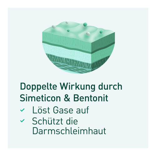 Bentonit, Hypromellose, Simethicon 50%, Mikrokristalline Zellulose, Magnesiumstearat, Titandioxid, Oleum helianthus.