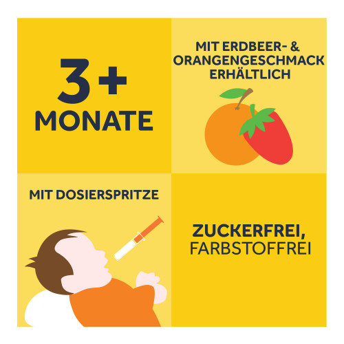 Nurofen Junior Fieber- und Schmerzsaft Orange 40 mg/ml Suspension zum Einnehmen. Wirkstoff: Ibuprofen. Anwendungsgebiete: Kurzzeitige symptomatische Behandlung leichter bis mäßig starker Schmerzen, Fieber. Warnhinweise: Enthält Maltitol und Natrium sowie Erdbeeraroma (enthält Propylenglycol).