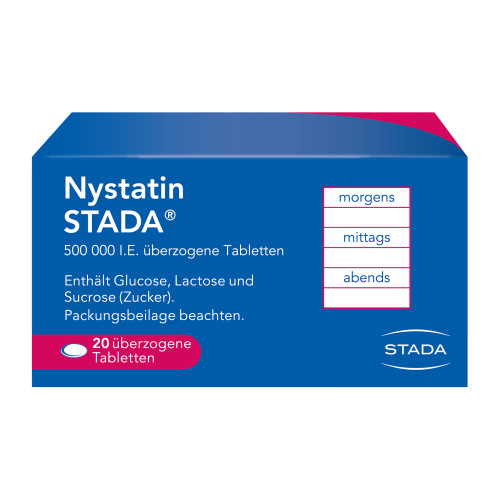 Nystatin STADA® 500.000 I.E. überzogene Tabletten. Wirkstoff: Nystatin. Anwendungsgebiete: Zur topischen intestinalen Behandlung nachgewiesener nystatinempfindlicher Hefepilzinfektionen, insbesondere als Folge einer Therapie mit Antibiotika, Zytostatika oder Kortikoiden. Warnhinweis: Enthält Glucose, Lactose und Sucrose (Zucker).