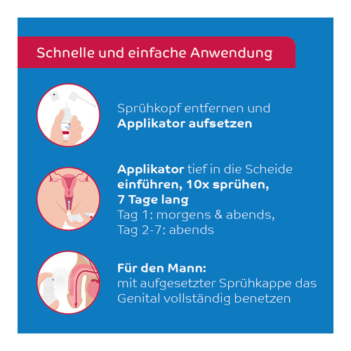 Wenden Sie das Arzneimittel immer genau wie in dieser Packungsbeilage beschrieben bzw. genau nach der mit Ihrem Arzt oder Apotheker getroffenen Absprache an. Fragen Sie bei Ihrem Arzt oder Apotheker nach, wenn Sie sich nicht sicher sind. Soweit nicht anders verordnet, den Vaginalapplikator am ersten Tag der Behandlung morgens und abends, danach einmal täglich abends tief in die Vagina einführen und die Sprühkappe des Applikators zehnmal hintereinander herunterdrücken. Die Behandlungsdauer beträgt sieben Tage. Vor der ersten Anwendung Schutz- und Sprühkappe von der Flasche abziehen und sicher verwahren, dann den Applikator aus der Hülle nehmen und ihn auf die Arzneimittel-Flasche aufsetzen. Es wird empfohlen, den Applikator auf der Toilette sitzend tief in die Vagina einzuführen. Danach ist die Sprühkappe des Applikators zehnmal hintereinander herunterzudrücken. Sprühen Sie nach der Anwendung mit nach unten gerichtetem Applikator etwas Präparat, z.B. über dem Waschbecken, aus.Spülen Sie den Applikator im Anschluss unter fließendem Wasser ab und trocknen Sie ihn mit einem sauberen Tuch. Vor erneuter Anwendung ist die oben beschriebene Reinigung zu wiederholen. Zur Vorbeugung einer erneuten Infektion sollte der Partner mit in die Behandlung einbezogen werden. Hierzu ist das Arzneimittel ohne Applikator mit aufgesetzter Sprühkappe auf das männliche Genital bis zur vollständigen Benetzung aufzusprühen. Um die gewünschte Wirkung zu erreichen, sind diese Vorgaben sorgfältig einzuhalten. Sollten die Beschwerden andauern oder nach Ende der Behandlung wiederkehren, ist eine frauenärztliche Abklärung notwendig.