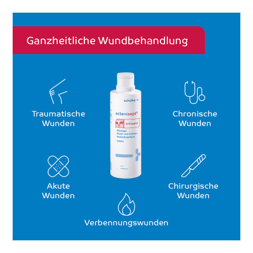 octenisept farblos ist ein Antiseptikum zur wiederholten, zeitlich begrenzten antiseptischen Behandlung von Schleimhaut und angrenzender Haut vor diagnostischen und operativen Maßnahmen - im Ano-Genitalbereich von Vagina, Vulva, Glans penis, auch vor Katheterisierung der Harnblase - in der Mundhöle. Zur zeitlich begrenzten unterstützenden Therapie bei Pilzerkrankungen der Haut zwischen den Zehen sowie zur unterstützenden antiseptischen Wundbehandlung.