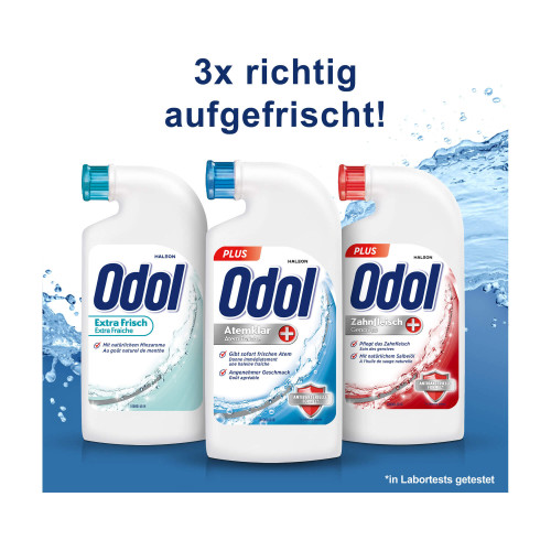 Produkt muss vor Gebrauch verdünnt werden. 3-5 Tropfen Odol Konzentrat in 50-60 ml (1/4 Glas) Wasser geben.