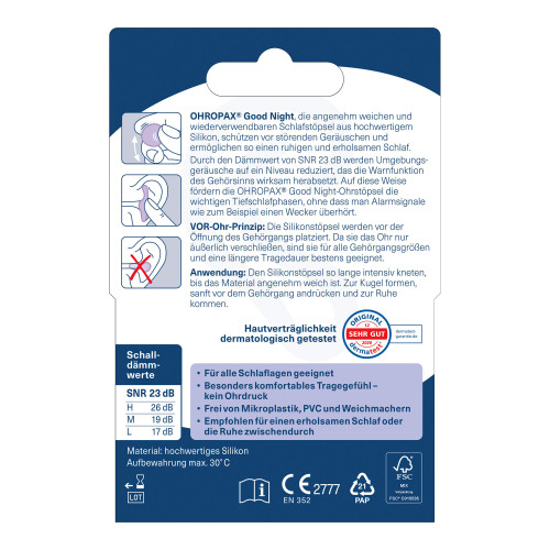 Im privaten Bereich: OHROPAX® Good Night ist aufgrund seines hohen Tragekomforts ideal für alle Schlaflagen gleichermaßen gut geeignet. Der Dämmwert von SNR 23 dB reduziert Umgebungsgeräusche auf ein Niveau, das die Warnfunktion des Gehörsinns wirksam herabsetzt. Die OHROPAX® Good Night-Ohrstöpsel fördern so die wichtigen Tiefschlafphasen, ohne dass man Alarmsignale wie z.B. einen Wecker überhört. Aber auch ideal beim konzentrierten Arbeiten, Heimwerken und bei lauter Musik sowie beim Baden und Duschen.