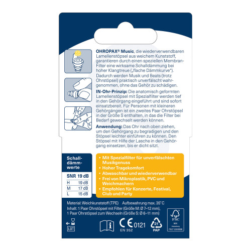 OHROPAX Music, die wiederverwendbaren Lamellenstöpsel aus weichem Kunststoff, garantieren durch einen speziellen Membran-Filter eine wirksame Schalldämmung bei hoher Klangtreue ("flache Dämmkurve"). Dadurch werden Musik und Beats (trotz Ohrstöpsel) praktisch unverfälscht wahrgenommen, ohne das Gehör zu schädigen.