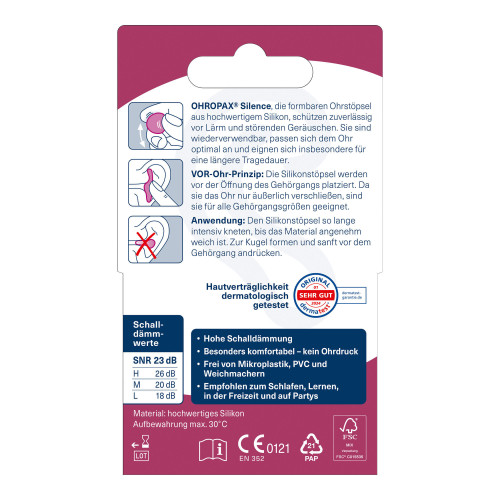 OHROPAX Silence, die formbaren Ohrstöpsel aus hochwertigem Silikon, schützten zuverlässig vor Lärm und störenden Geräuschen. Sie sind wiederverwendbar, passen sich dem Ohr optimal an und eignen sich insbesondere für eine längere Tragedauer.